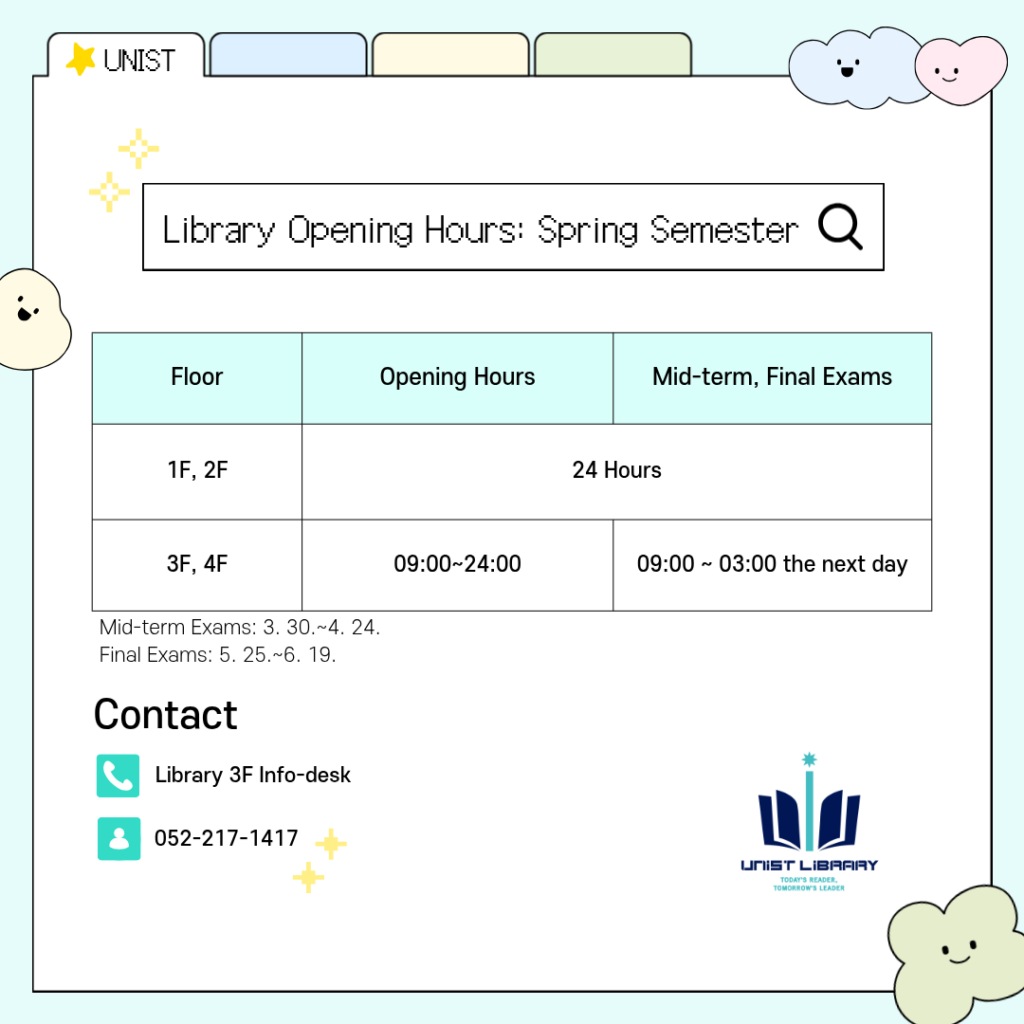 ※ Contact Info.: Library 3F Info-Desk (052-217-1417, library@unist.ac.kr)