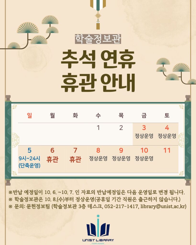 학술정보관 추석 연휴 기간 휴관 안내 (10. 5. ~ 10. 7.)