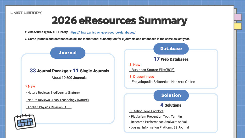 2026년 UNIST Library에서 구독 및 서비스 하는 전자정보원 (전자저널, 학술데이터베이스) 리스트를 안내합니다.